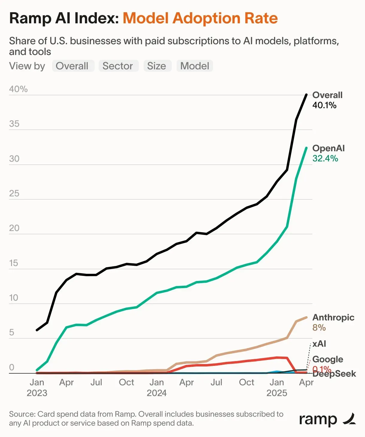 Zumindest was tech-affine Unternehmen angeht, welche das Expense-System von Ramp einsetzen. (via (via)) (Ich bin außerdem relativ sicher, dass hier nicht API-Ausgaben erfasst werden.)