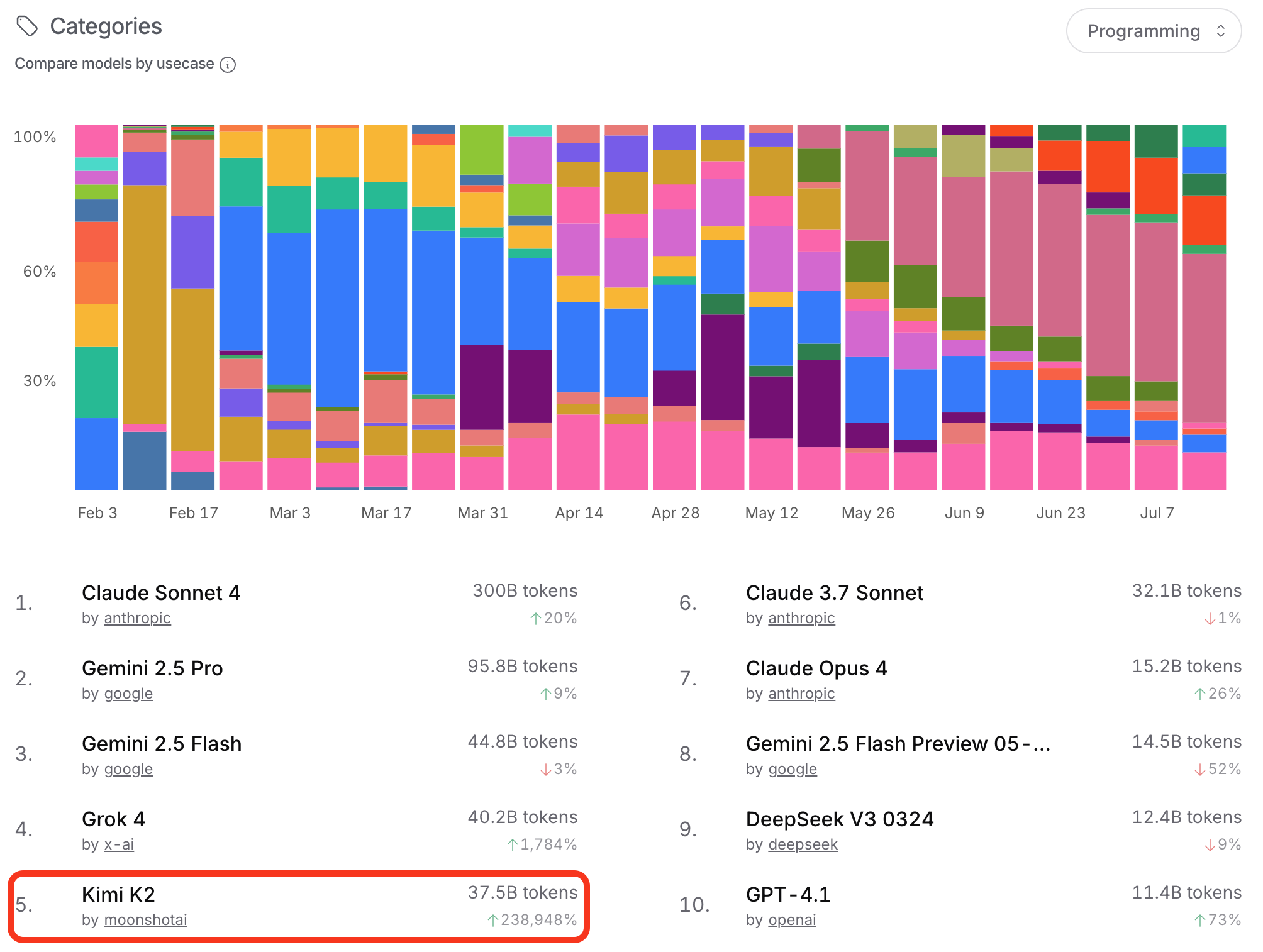 Kimi K2 ist im Ranking der tatsächlichen Nutzung auf Openrouterbereits auf Platz 5 in der Kategorie Programmieren gelandet, eine Woche nach Veröffentlichung: