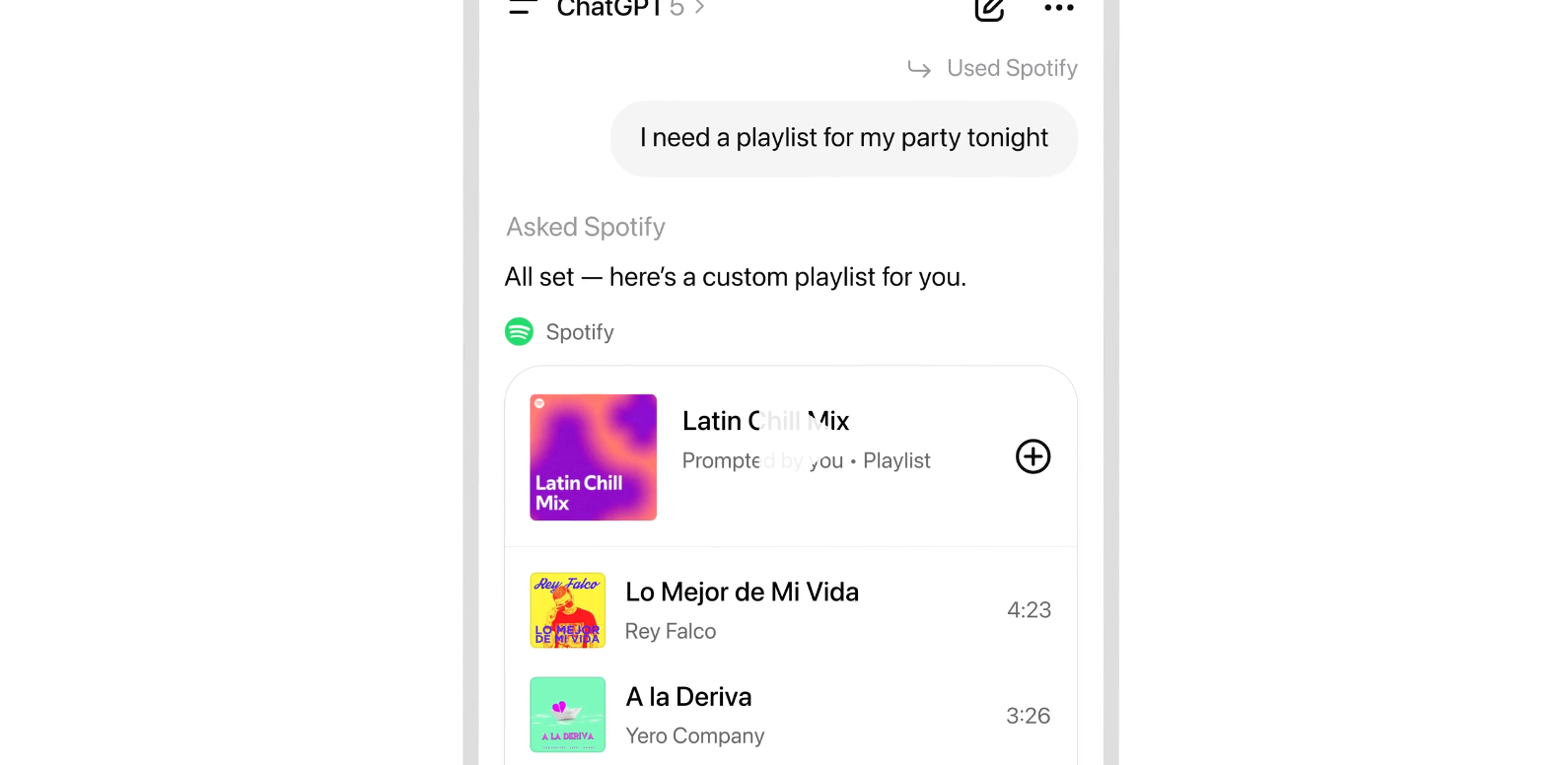 Spotify‑Details als Bsp.: Spotifys Integration bietet maßgeschneiderte Empfehlungen, Stimmungs‑/Genre‑/Artist‑Playlists und Klick‑zum‑Anhören; Inhalte der Plattform werden nicht mit OpenAI zum Training geteilt.
