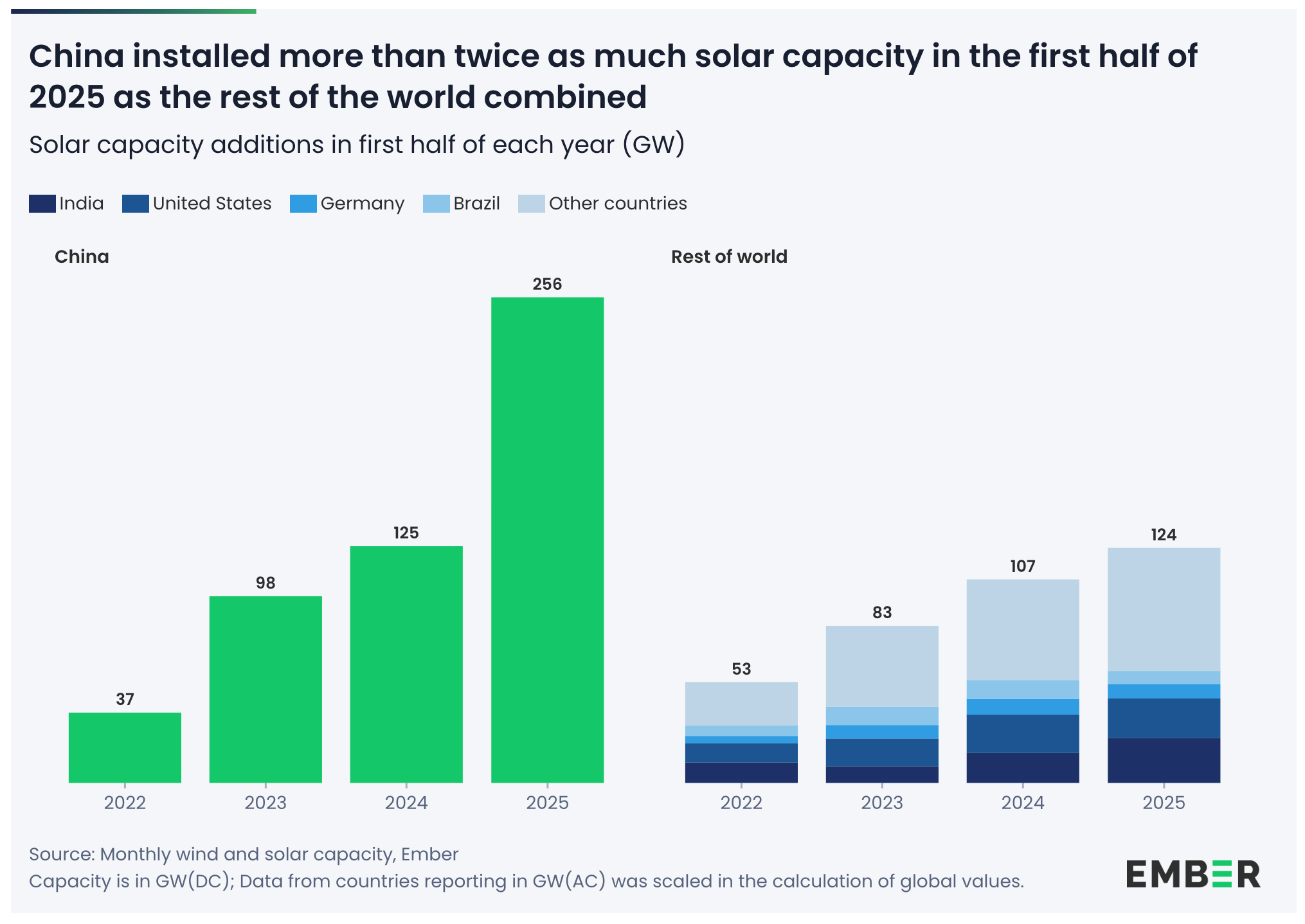 Länder wie China oder Bhutan werden globale Gewinner aufgrund ihrer Energiestrategie. China baut im Jahr zweimal so viel Solarkapazität auf, wie die USA insgesamt bis heute gebaut haben. Oder auch: zwei Mal so viel wie der Rest der Welt zusammen im selben Zeitraum: