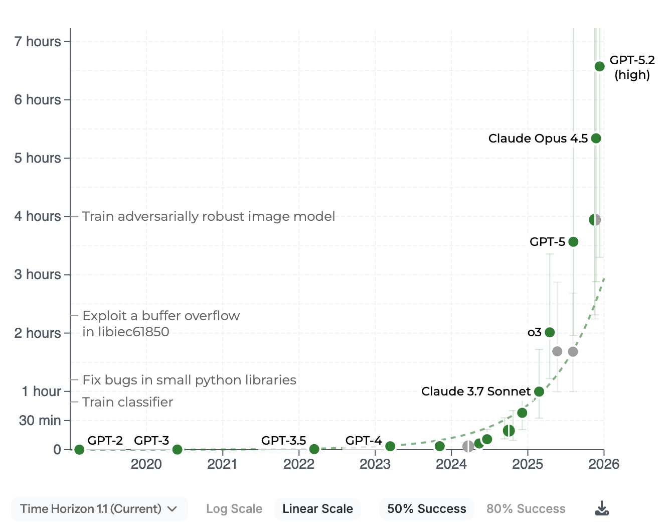 Mittlerweile sind GPT-5.3 Codex und Claude Opus 4.6 erschienen. Beide sind optimiert für Programmieraufgaben und werden dementsprechend noch besser abschneiden. (Metr misst nur Programmieraufgaben, weil hier sowohl Zeit als auch Erfolg bei Menschen und bei KI leicht messbar sind.)