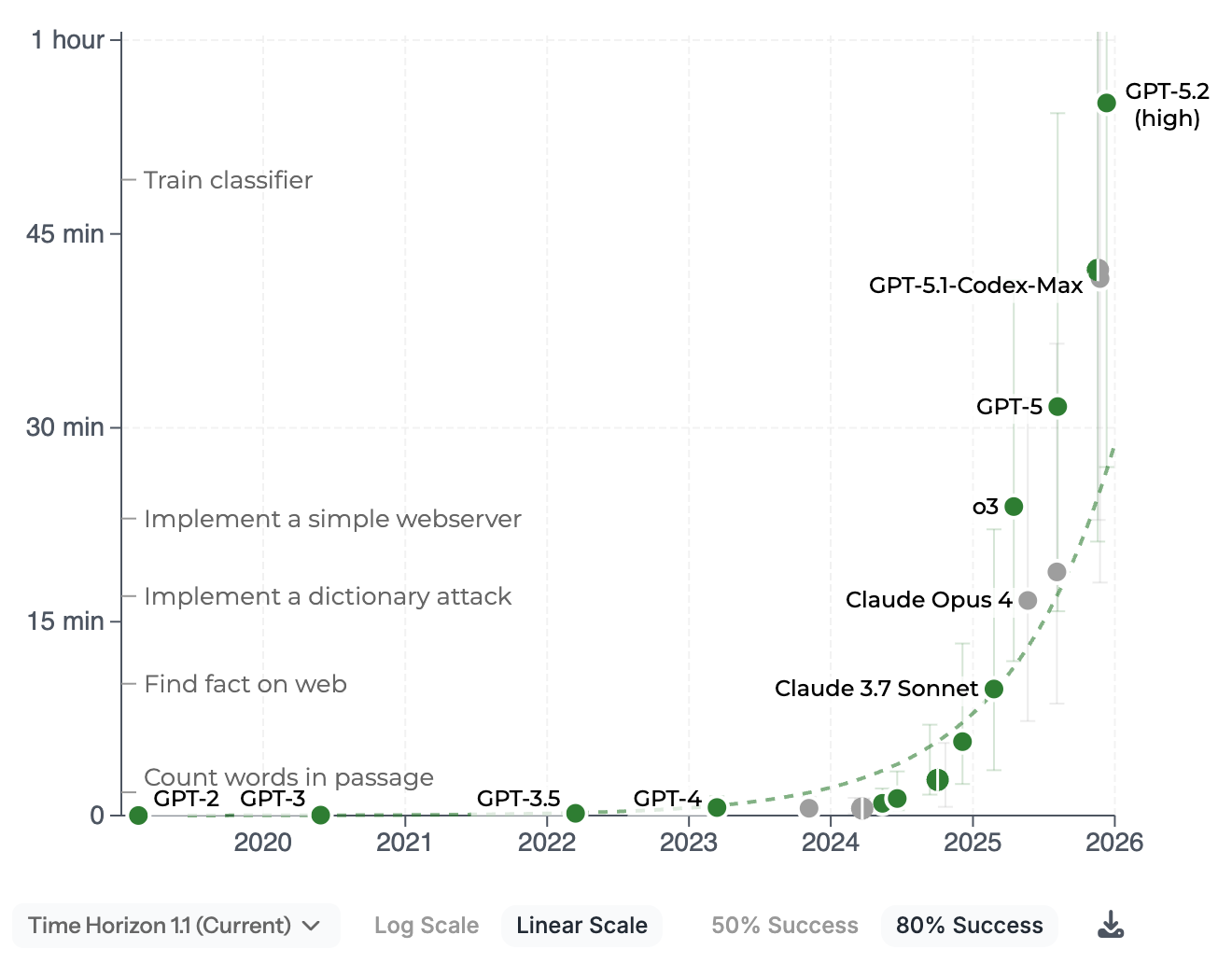 Die jüngsten Modelle von OpenAI und Anthropic, GTP-5.2 (high) und Opus 4.5 im anschaulichen Metr-Graphen. Metr misst, wie hoch die Komplexität der Aufgaben ist, die KI-Modelle in zu 80 bzw. 50 Prozent erfolgreich erledigen können. Komplexität wird daran bemessen, wie lang ein Mensch benötigt, um die gleiche Aufgabe zu erfüllen.