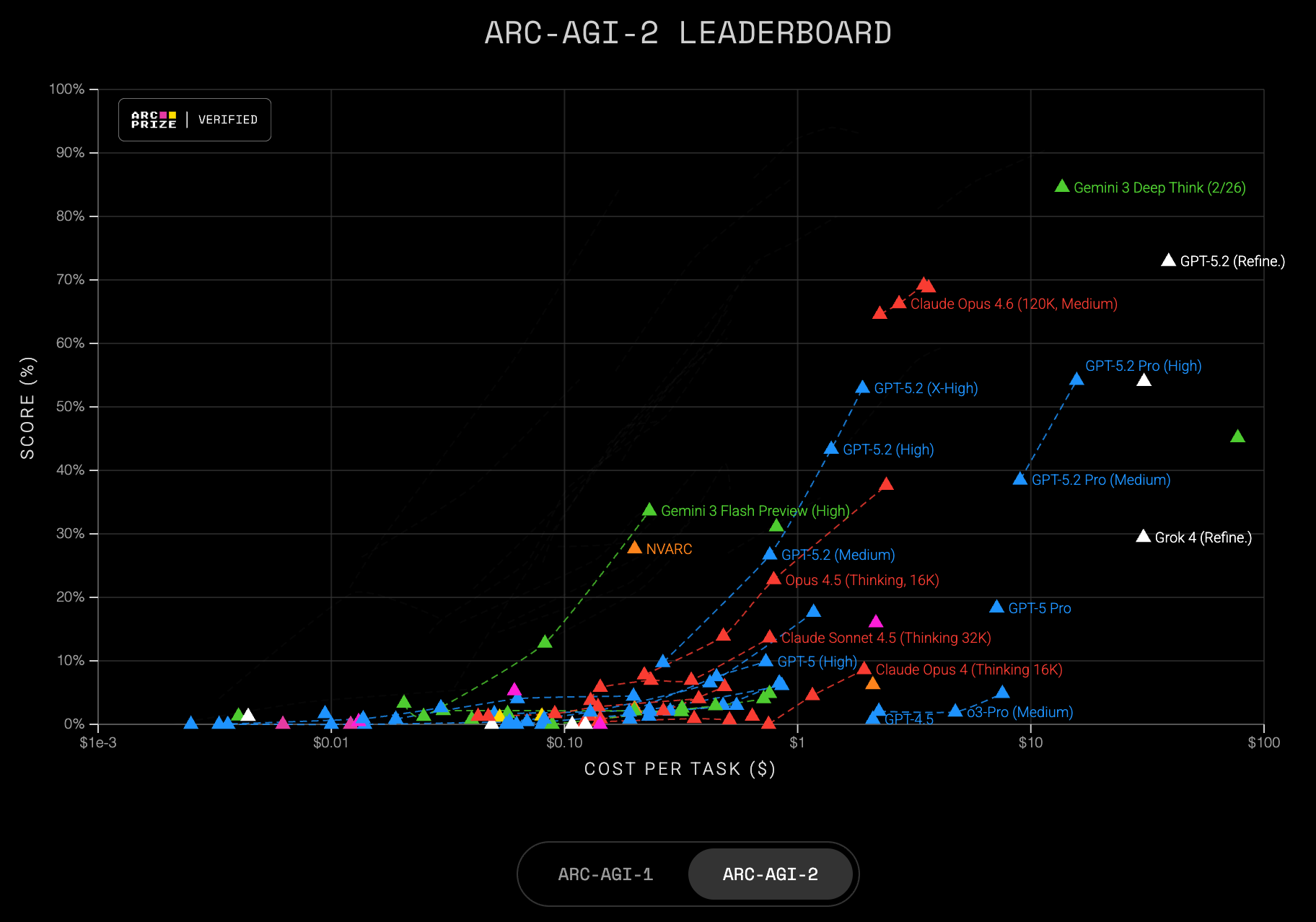 Nicht einmal ein Jahr nach der Einführung des neuen ARC-AGI-2, wir haben noch Februar, liegt das aktuell beste KI-Modell bei 84,6 Prozent.