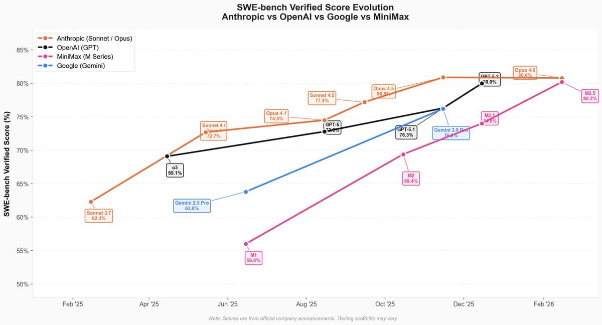 Besonders MiniMax 2.5 beeindruckt die Branche, es soll wohl ungefähr auf Augenhöhe mit Opus 4.6 liegen (während es um das 20-fache günstiger ist):