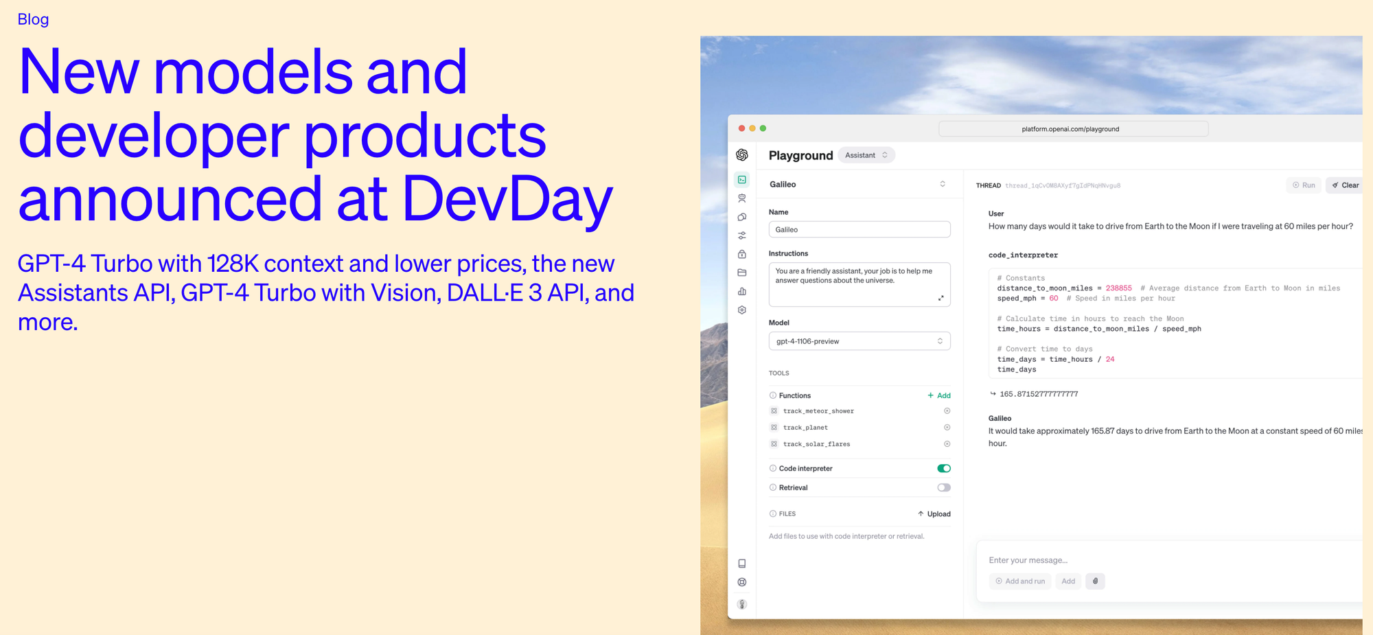 This API is designed for flexibility; use cases range from a natural language-based data analysis app, a coding assistant, an AI-powered vacation planner, a voice-controlled DJ, a smart visual canvas--the list goes on. The Assistants API is built on the same capabilities that enable our new GPTs product: custom instructions and tools such as Code interpreter, Retrieval, and function calling.