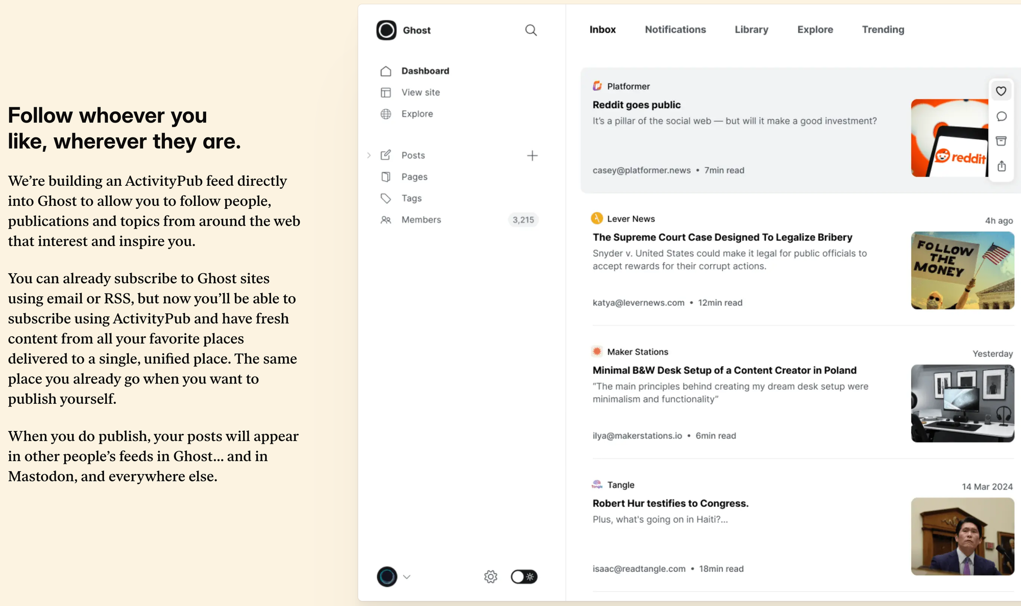 - Ghost, ein Open-Source-CMS, das Newsletter und Abonnements integriert, wird ebenfalls ActivityPub integrieren.