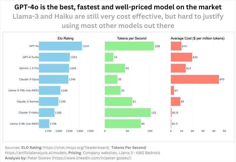 GPT-4o kostet ein Fünftel (!) von Claude Opus, ist sehr viel schneller und besser.