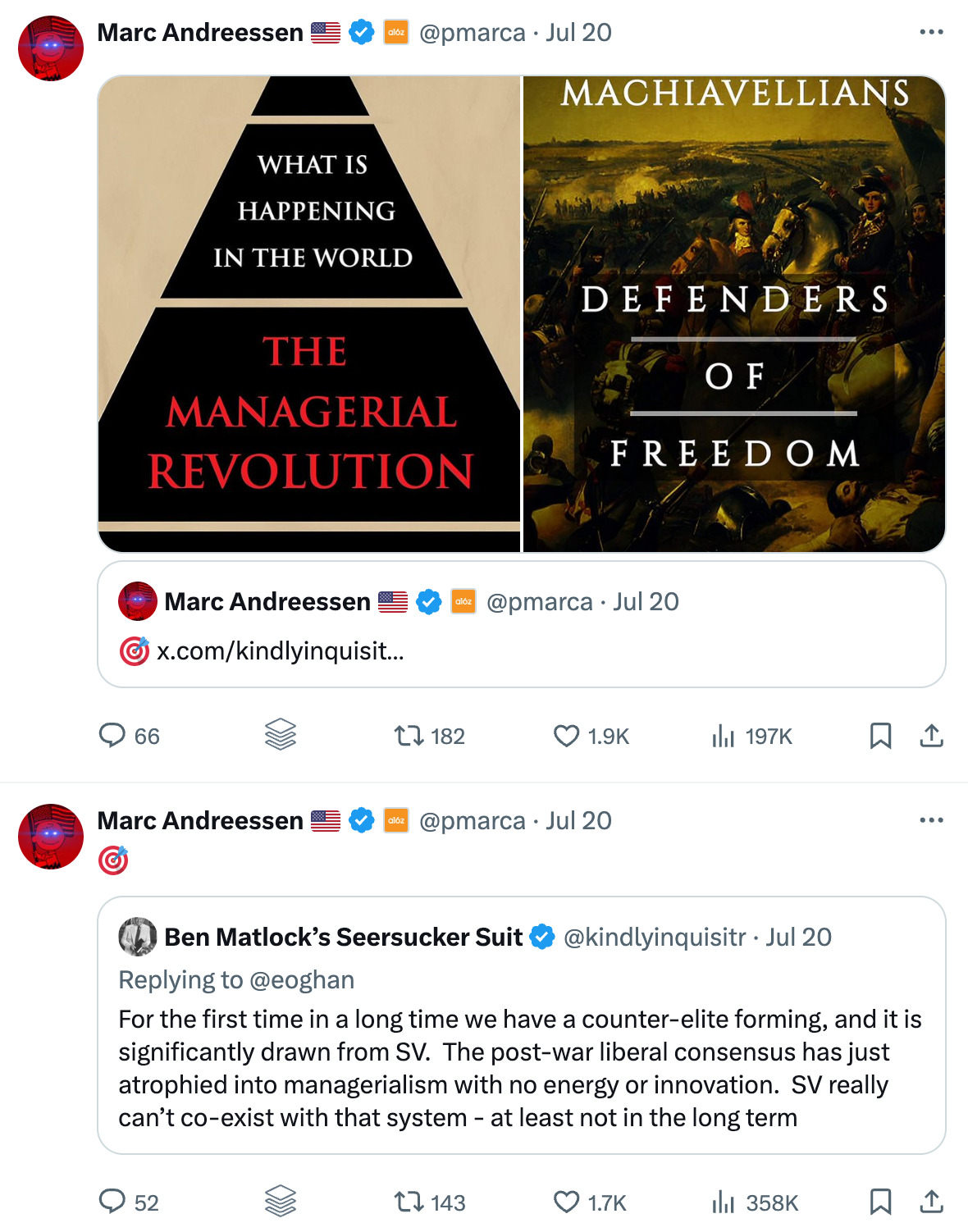 Ich sage das, weil Andreessens andere öffentliche Äußerungen sehr deutlich machen, dass es hier einen sichtbaren Bürgerkrieg unter den Eliten der USA gibt. Man mag darüber lachen, dass der Milliardär Andreessen sich nicht als Establishment sieht. Aber tatsächlich sind es zwei Gruppen mit unterschiedlichen Sichtweisen, die sich schwer bis gar nicht in links/rechts einordnen lassen.