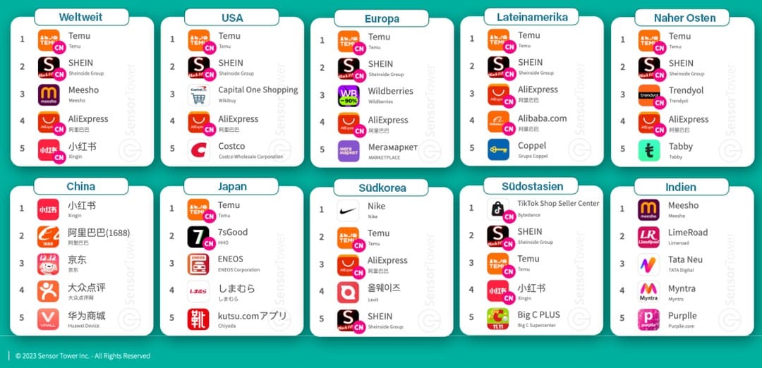 Von außen betrachtet fällt erst einmal der immense Erfolg des gerade ein(!) Jahr alten Temu auf, das sich laut SensorTower in allen großen Regionen weltweit an die Spitze der App-Charts gesetzt hat: