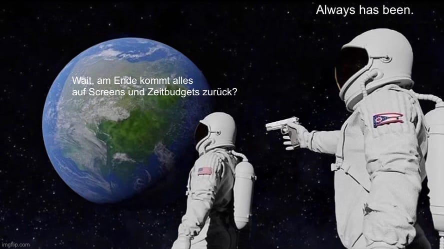 Es mag metaphysisch abgehoben klingen, aber am Ende des Tages (ha!) geht es um unsere Wachzeit und wer dort wertvollen Platz von uns bekommt. Kategorien und Märkte sind (fast) egal, Zeit ist alles. Weil sie in vielen Aspekten die letzte relevante verbliebene Knappheit ist und bleibt.